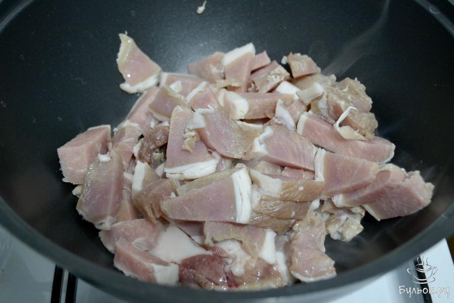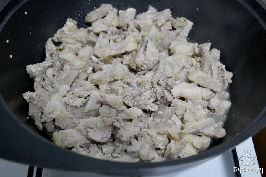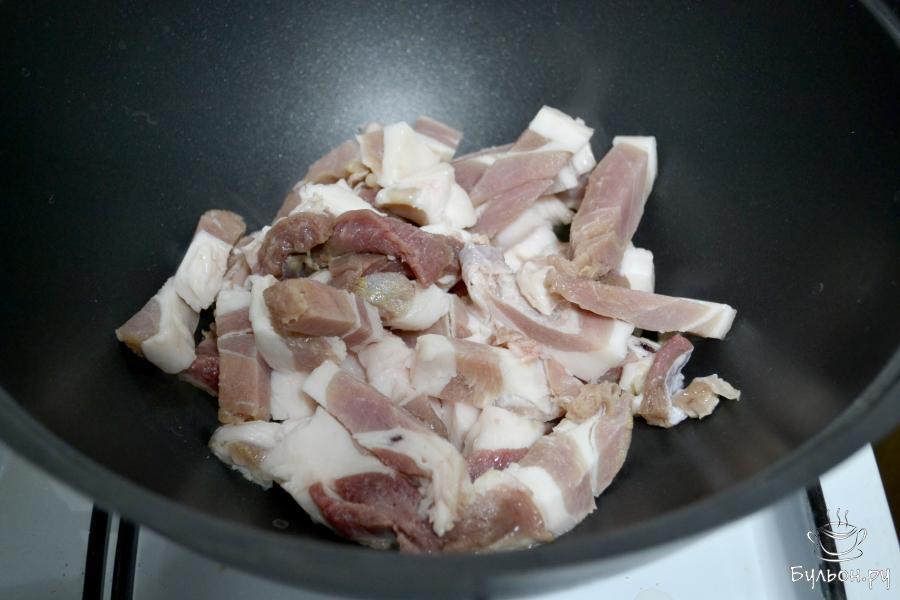 1. Жирную часть свинины нарежьте тонкими брусочками и положите в казан. Обжаривайте на среднем огне, чтобы вытопился жир в течение 10-15 минут.
