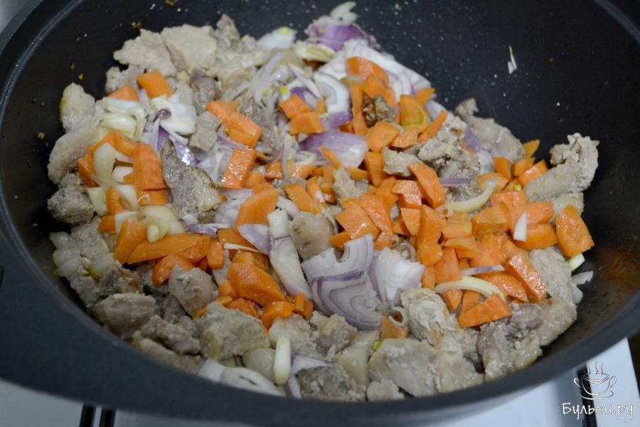 4. Когда мясо будет почти готово, добавьте в казан очищенные и нарезанные морковь и репчатый лук. Посолите. Перемешайте и продолжайте тушить до мягкости моркови.