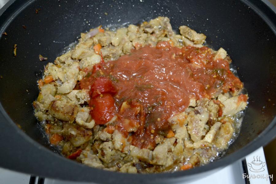 5. За 5-7 минут до отключения плиты, добавьте в казан томатную пасту, помидоры в собственном соку или, как в рецепте, лечо. Лечо очень удобно использовать - здесь и сладкий перец, и помидоры, и лук. Перемешайте.