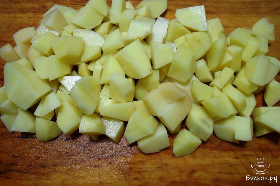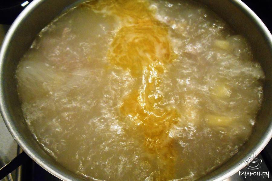 6. В бульон добавить картофель и куриное мясо, довести до кипения. Убавить огонь и варить на медленном огне до готовности картофеля.