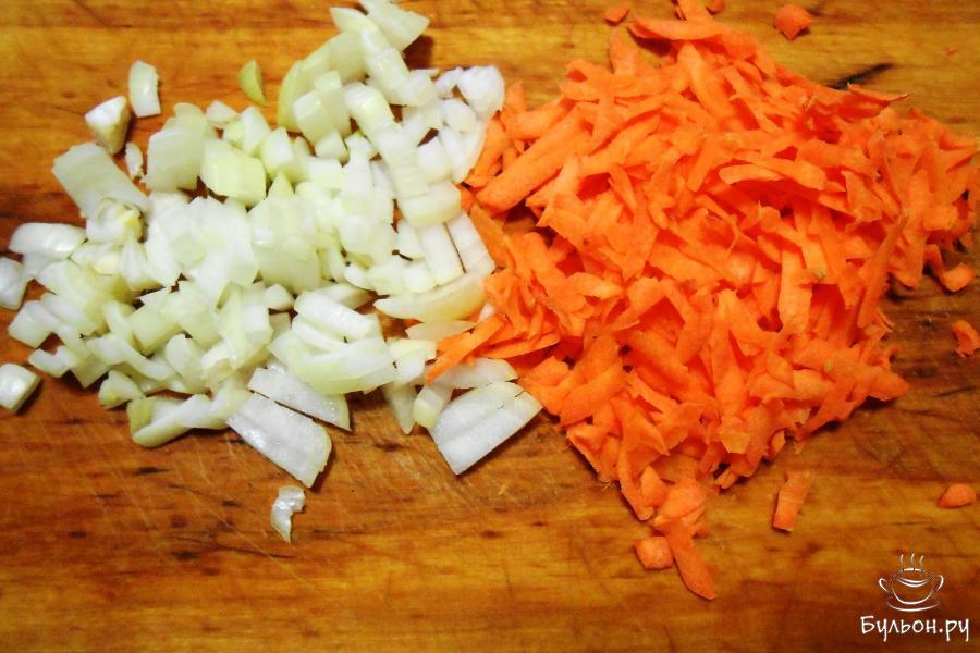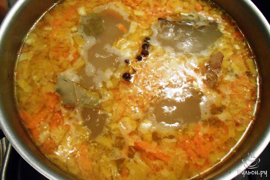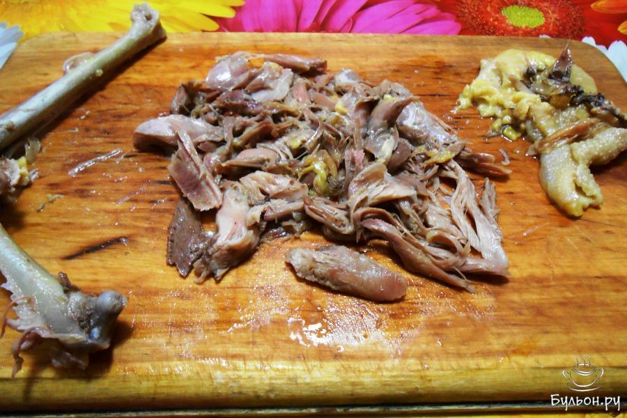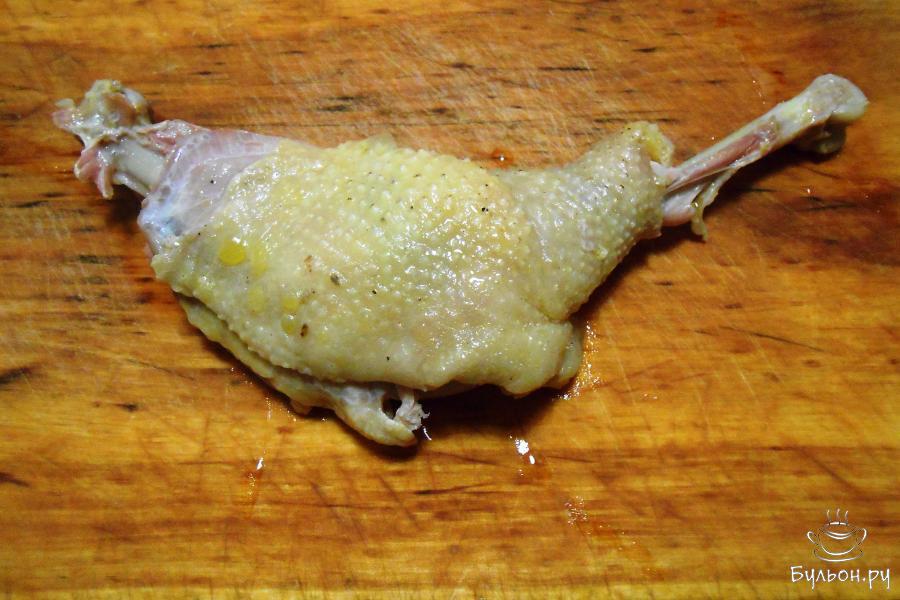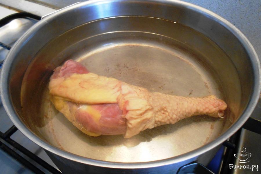 1. Куриный окорочок положить в кастрюлю, налить 2,5 литра воды, довести до кипения, снять пенку и варить на медленном огне под крышкой 2 часа до мягкости.