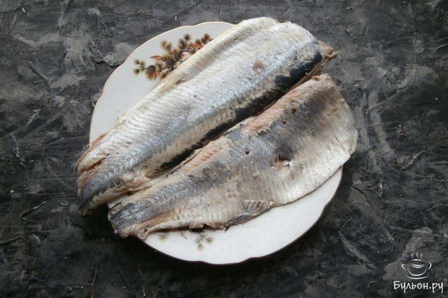 6. Полностью готовую, малосольную пряную селедочку почистить (снять кожу), отделить филе от хребта и удалить все мелкие косточки.