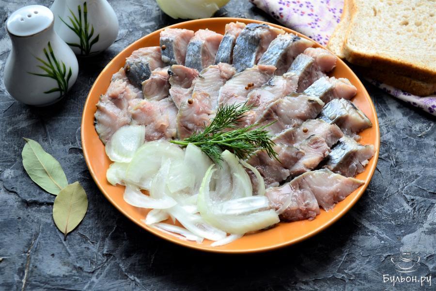 7. И теперь, порезать филе небольшими тонкими кусочками, красиво выложить на блюдо или в селедочницу вместе с оставшимся порезанным репчатым луком, полить ароматным маслом. Приятного аппетита.