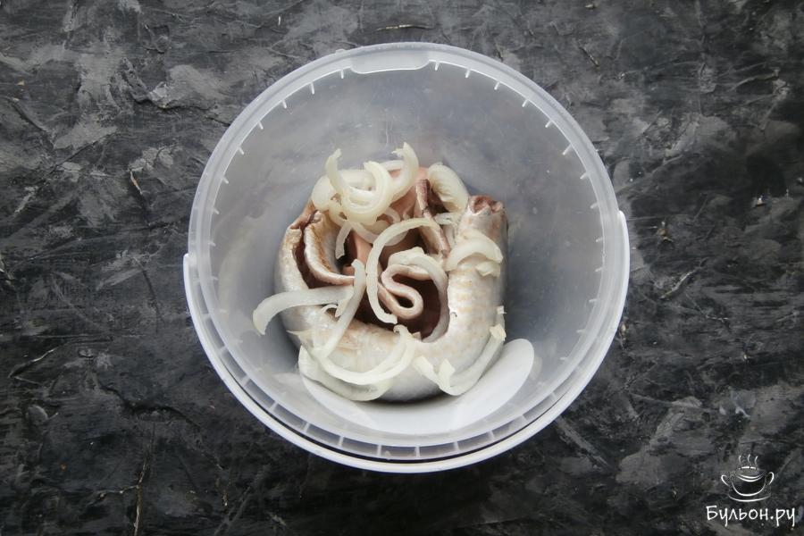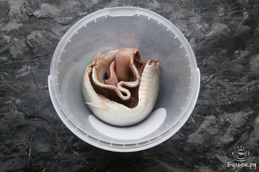 2. Селедку разместить в любом пластиковом контейнере, ведерке или другой емкости разрезанным брюшком кверху.