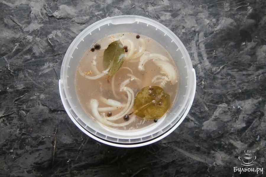 5. Рассолу дать полностью остыть, затем, залить им селедку. Накрыть посуду с сельдью крышечкой и поместить в прохладное, темное место на 2 суток.
