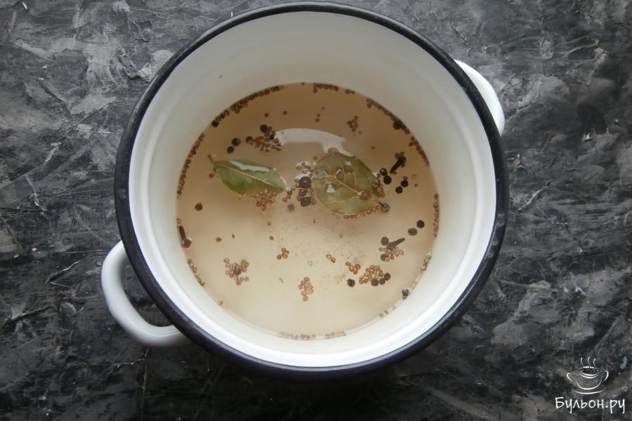 4. В кастрюльку налить 0,5 литра холодной воды. Добавить крупную каменную соль, сахар, лавровый лист (пару штук), душистый и черный перец горошком, семена кориандра и 3 гвоздички. Также, влить 40 мл обычного столового уксуса. Довести все до кипения, снять кастрюльку с огня.