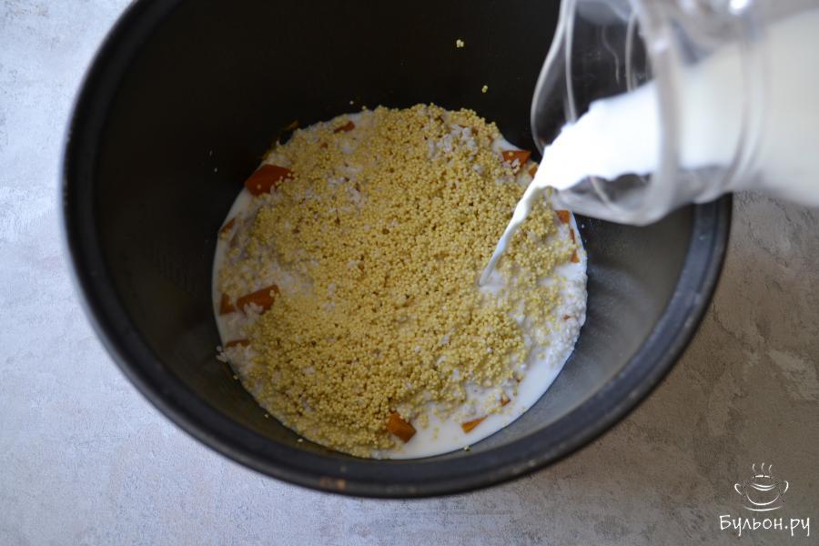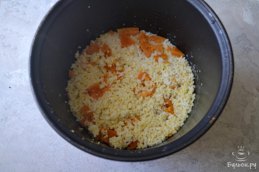 7. Добавьте в чашу горячую воду, всыпьте соль и выберете режим "Мультиповар" 115 градусов на 40 минут. Также можно варить на режиме "Каша" или "Молочная каша". В любом случае ориентируйтесь на особенности своей мультиварки.