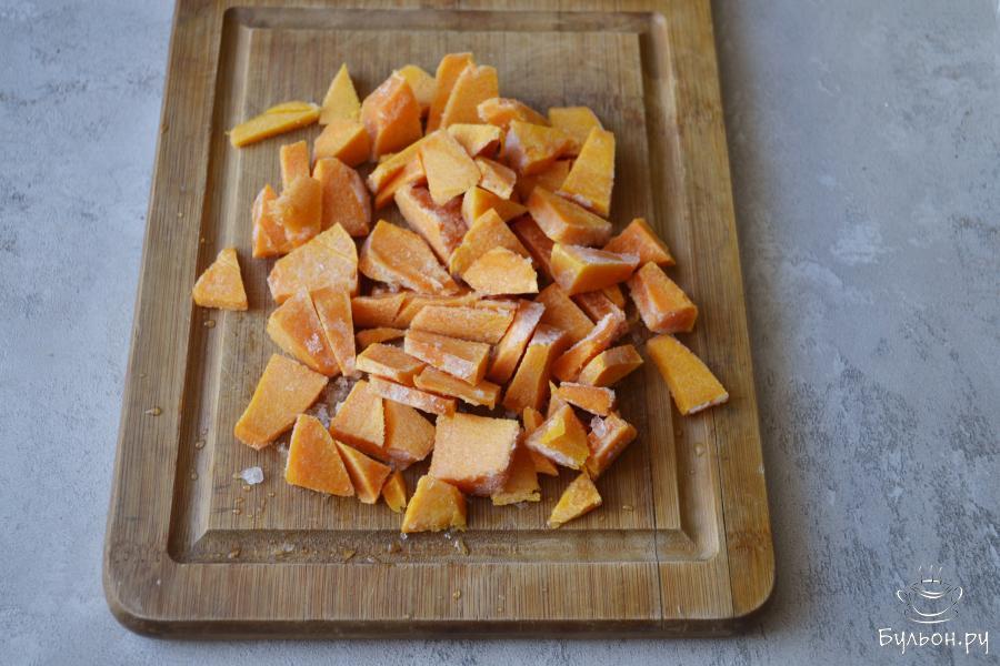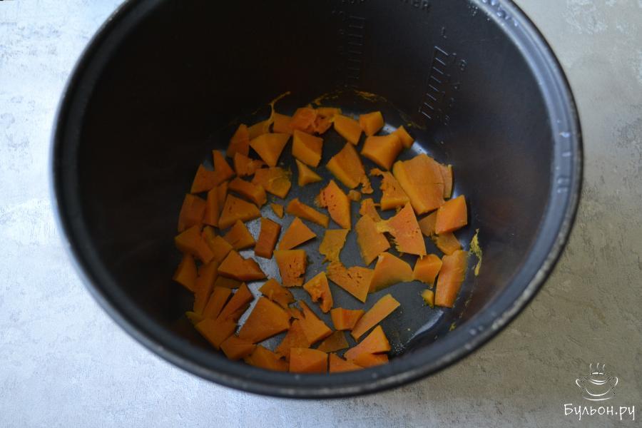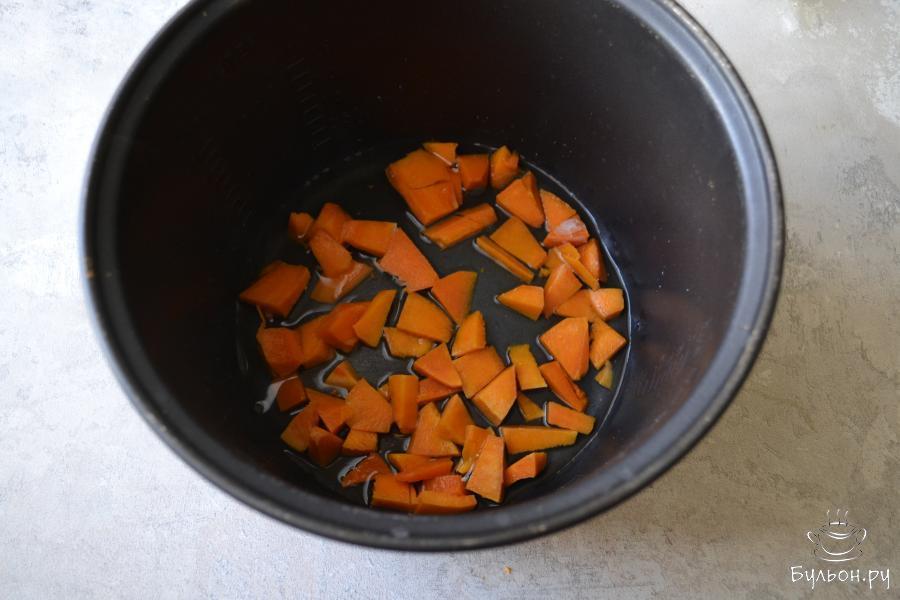 2. Тыкву положите в чашу мультиварки и влейте немного воды, чтобы только покрыла кусочки тыквы. Поставьте чашу в мультиварку и выберете режим "Мультиповар" 115 градусов на 10-15 минут.