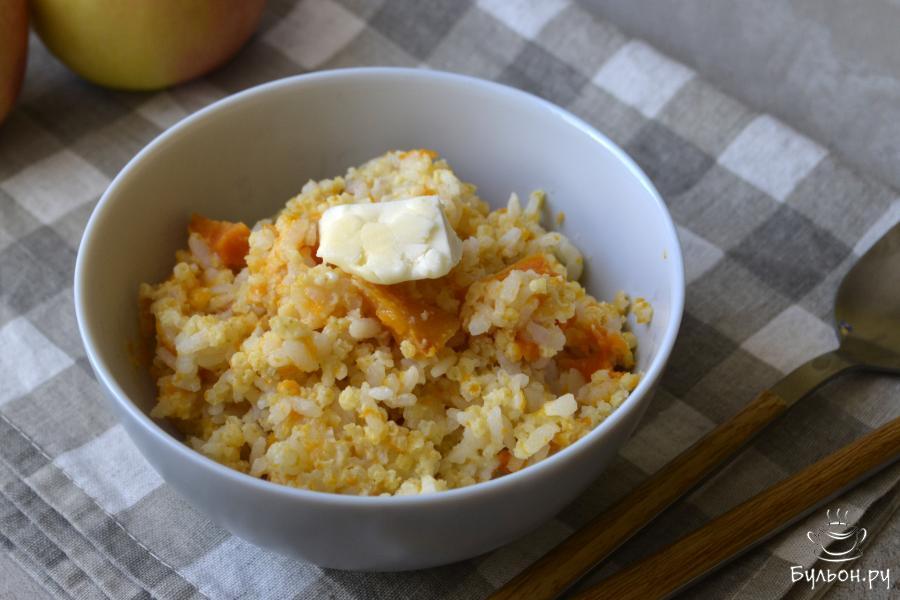 Лучший завтрак - это каша. Если привычная каша наскучила, приготовьте кашу "Дружба" из двух видов круп: пшена и риса и еще добавьте тыкву. Получается очень вкусно, полезно и удобно готовится в мультиварке. Кашу можно сварить на чистом молоке, воде или использовать молоко пополам с водой. В рецепте сахара нет, так как тыква сладкая. Поэтому, сахар тоже добавляйте исходя из своих вкусовых предпочтений. В конце варки в кашу можно положить изюм, курагу или финики.