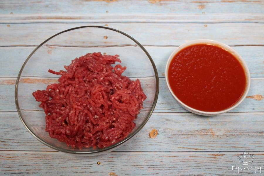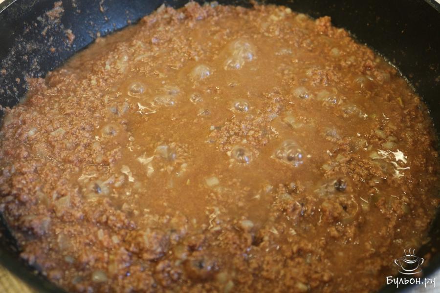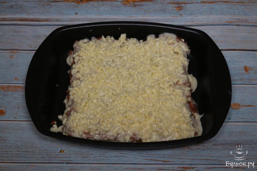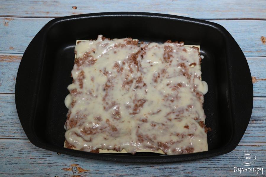 8. Теперь в форму выкладываем слоями ингредиенты, поделив их на три порции. В начале листы лазаньи, затем фарш с помидорами и соус. Последний третий слой посыпаем сверху тертой моцареллой.