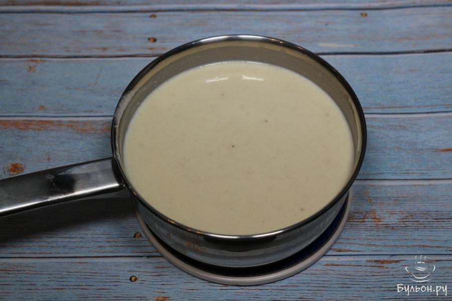 6. Греем муку 3 минуты, помешивая. Добавляем масло, размешиваем и снимаем ковш с плиты. Вливаем молоко, вымешиваем венчиком, чтобы не было комочков. Ковш снова ставим на плиту, добавляем соль, сахар, мускатный орех. Постоянно мешаем соус, доведя его до необходимой густоты, примерно как сметана.