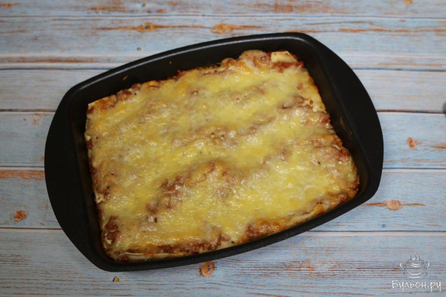 10. Затем вынимаем форму с лазаньей и даем ей настояться до 7 минут. Лазанья с фаршем и моцареллой готова.