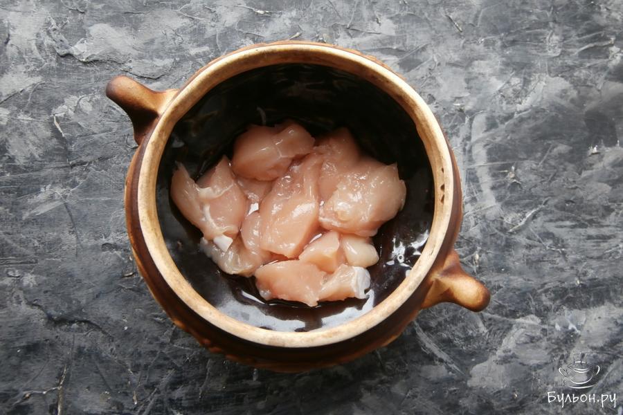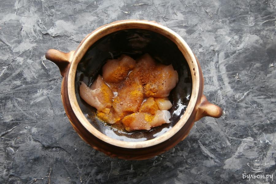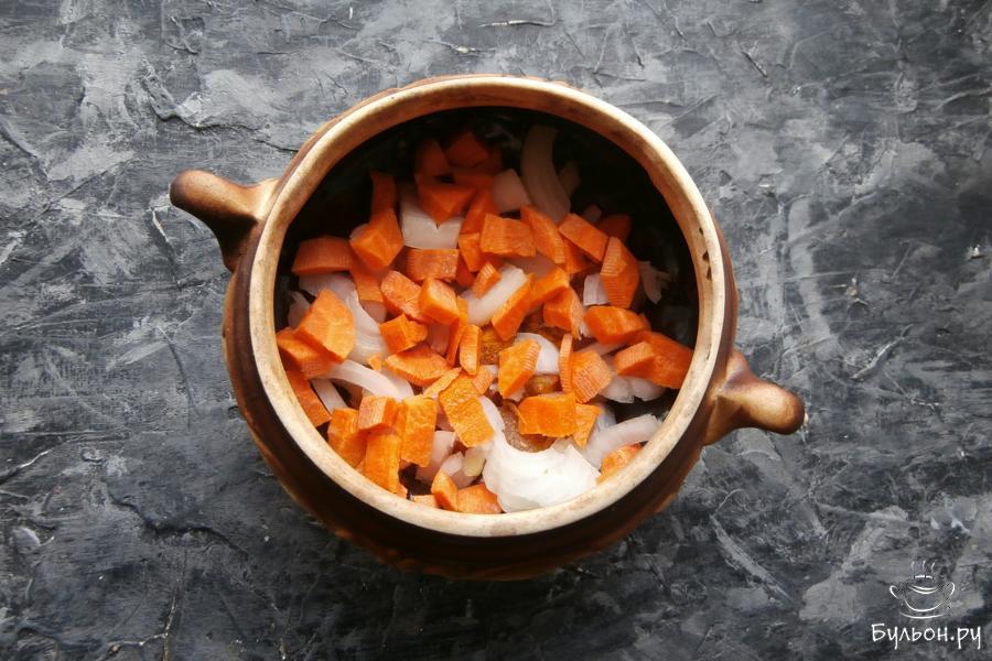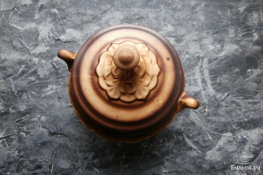 6. Накрыть все крышечкой или, если ее нет - фольгой и отправить горшок в еще не разогретую духовку. Выставить температуру духовки 180 гр. и готовить блюдо 1 час.