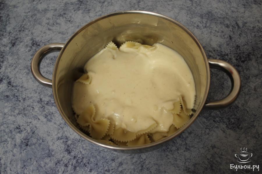 7. Соединяем отварные бантики с приготовленным горячим соусом, перемешиваем, пробуем и при необходимости добавляем еще специи.
