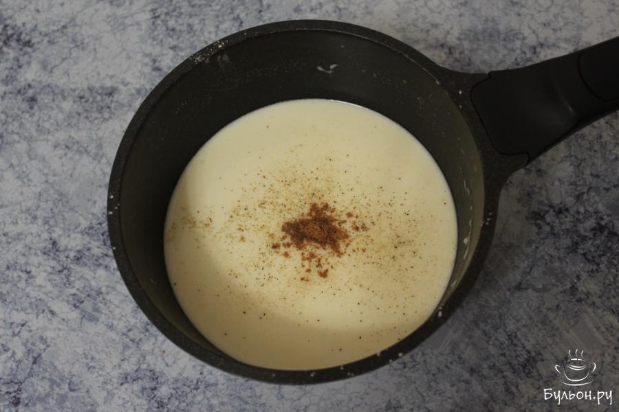 3. Вольем нежирное молоко и приправим специями по вкусу. Мускатный орех лучше взять цельный и натереть его на терке, но можно добавить и молотый. Также приправим черным молотым перцем и солью. Мешаем венчиком и ждем, когда соус слегка загустеет.