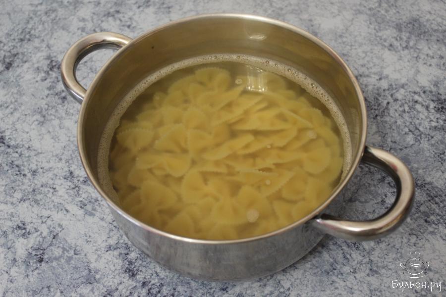 1. Макаронные бантики отварим в подсоленной воде, чтобы они были немного жестковаты, то есть не переварены. Лучше, если они будут слегка не доготовлены.