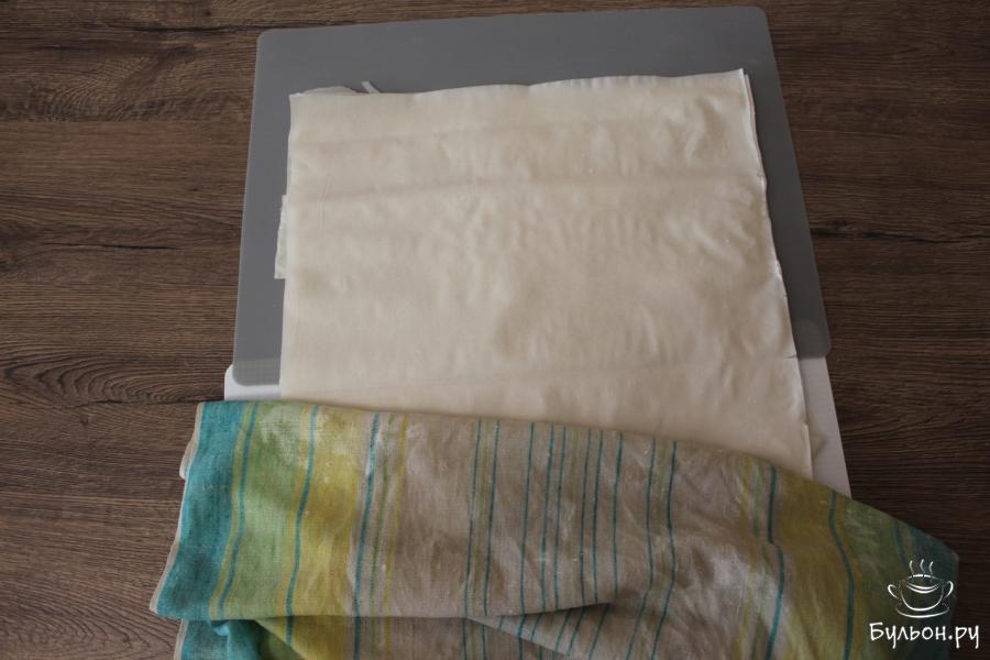 1. Сначала изучите инструкцию по размораживанию теста на упаковке и следуйте нужному описанию. Я разморозила тесто в течение 3 часов, не вскрывая упаковки, а затем, вскрыв упаковку, развернула листы теста и на 5 минут накрыла их влажным полотенцем. Так тесто наполнилось кислородом и оживилось.