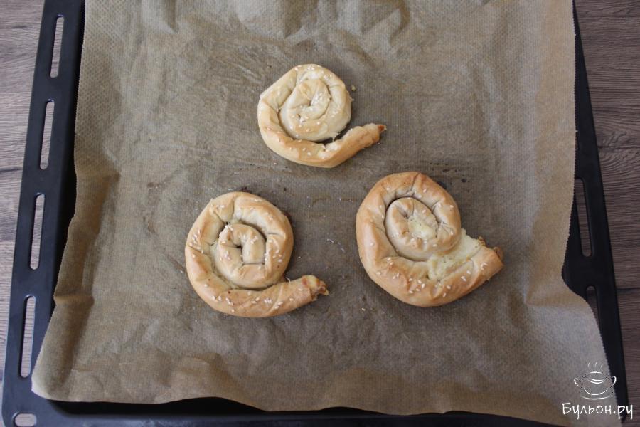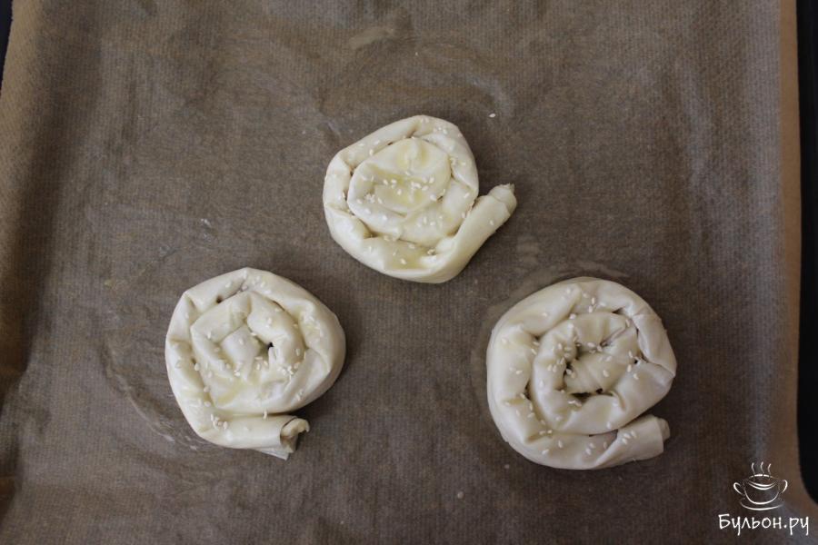 6. Все три свернутые улитки переложим на противень, который сначала застелем пекарской бумагой и, обмакивая кондитерскую кисточку в растопленное сливочное масло, смажем этим маслом улитки. Для украшения посыпаем улитки кунжутом.