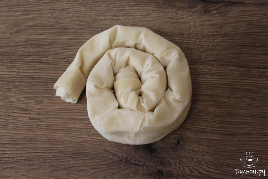 5. Завернем начинку внутрь рулетом, а потом рулет будем поворачивать вокруг себя чтобы получилась улитка.