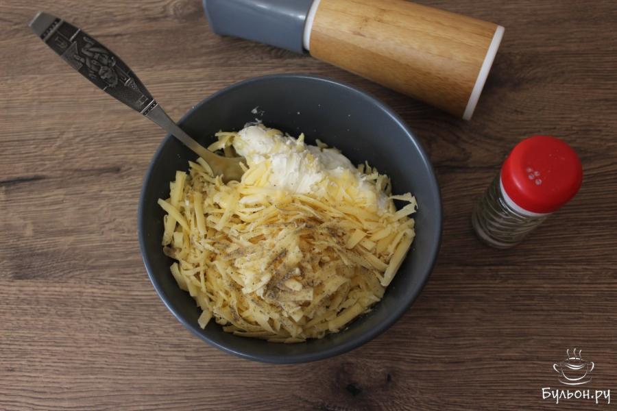 2. Чтобы приготовить сливочно-сырную улитку, смешаем в миске размягченный сливочный сыр, твердый натертый сыр, перец и соль.