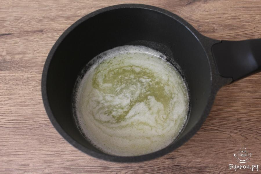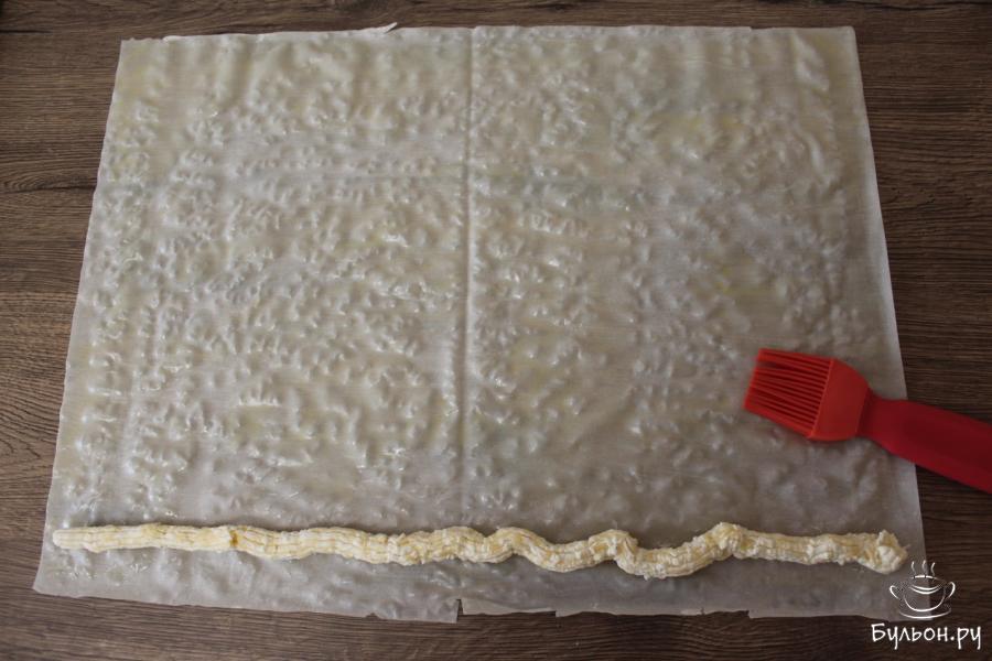 4. Выложим на рабочую поверхность лист фило и, обмакивая кондитерскую кисточку в растопленное сливочное масло, смажем им весь лист. На край с помощью кондитерского шприца выдавим сливочно-сырную начинку.