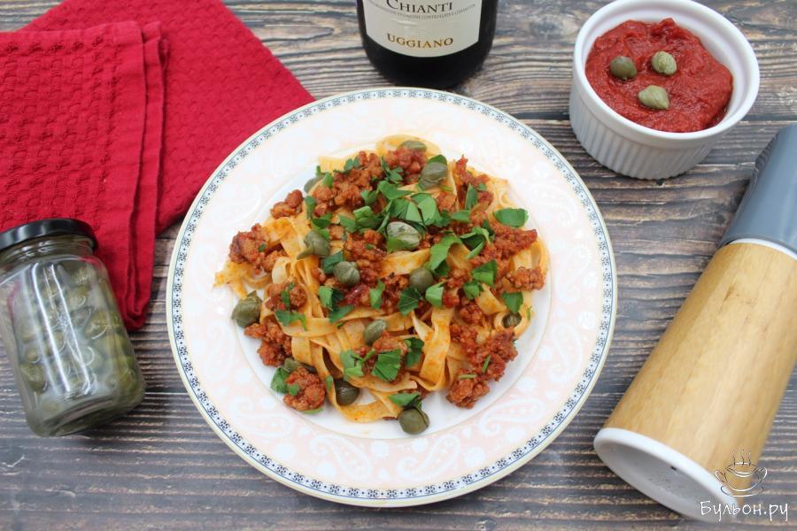 Даже обычные макаронные изделения можно превратить во вкуснейшее полноценное блюдо. Так обычным вечером я решила приготовить томатную пасту с каперсами. Все ингредиенты очень простые за исключением самих каперсов, в них и скрывается та самая изюминка вкусной хорошей пасты для всей семьи на ужин. Макаронные изделия можете использовать любые, я предпочла пасту тальятелле. Свинину можете заменить на говядину. А в остальном следуйте рецепту.