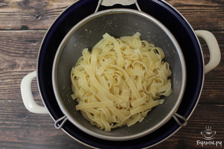 4. В соответствии с инструкцией на упаковке отварим макаронные изделия в воде, слегка подсолив воду при вскипании. Готовые макароны откинем на дуршлаг и сольем лишнюю жидкость.