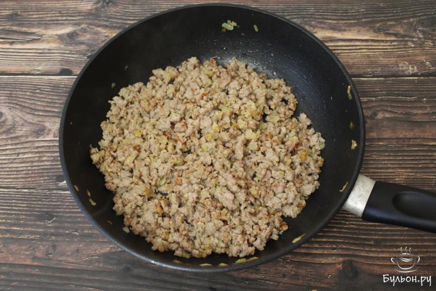 2. Свинину пропустим через мясорубку, и провернутое мясо переложим в сковороду к луково-чесночной зажарке. Продолжим жарить, мясной сок должен полностью испариться, после чего продолжим жарить мясо, чтобы у фарша схватилась небольшая корочка.