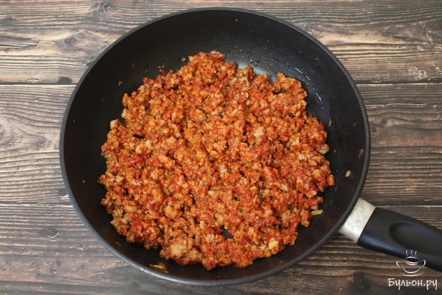 3. Добавим томатную пасту и приправы в виде соли и перца, очень хорошо перемешаем ингредиенты в сковороде. Должна получиться однородная масса красного цвета.