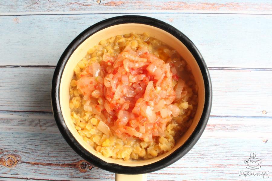 4. Добавляем к луку перетертый через терку помидор и тушим овощи еще 2-3 минуты. если свежего помидора под рукой нет, то добавляем 1 ст. л. томатной пасты.