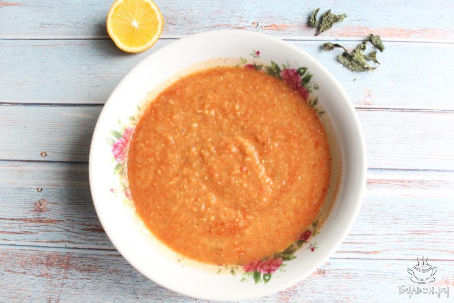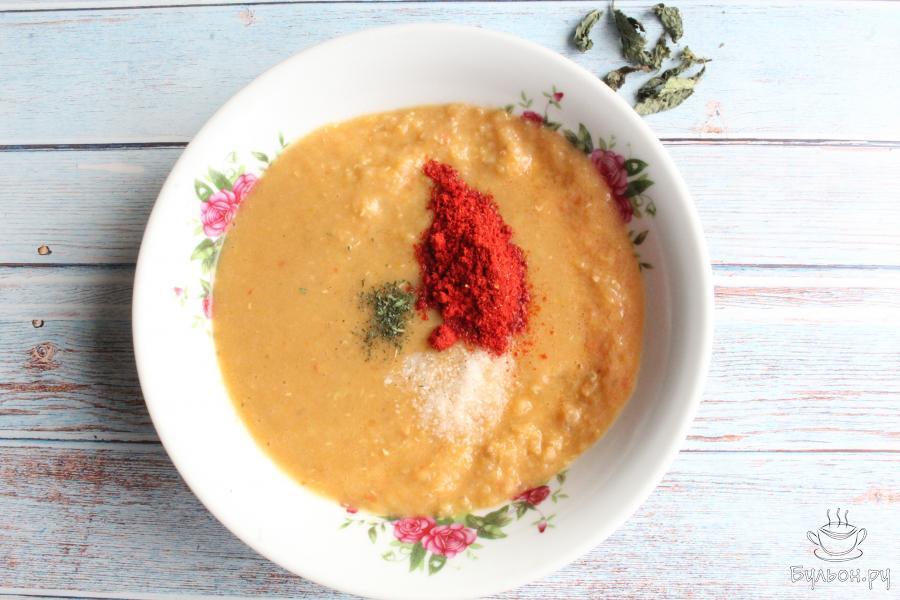 8. Добавляем в суп сладкую паприку, мяту, соль. Перемешиваем. Мяту можно добавить сразу, а можно добавить при подаче отдельно в каждую порцию. Если суп очень густой, то добавляем оставшуюся кипяченную воду.