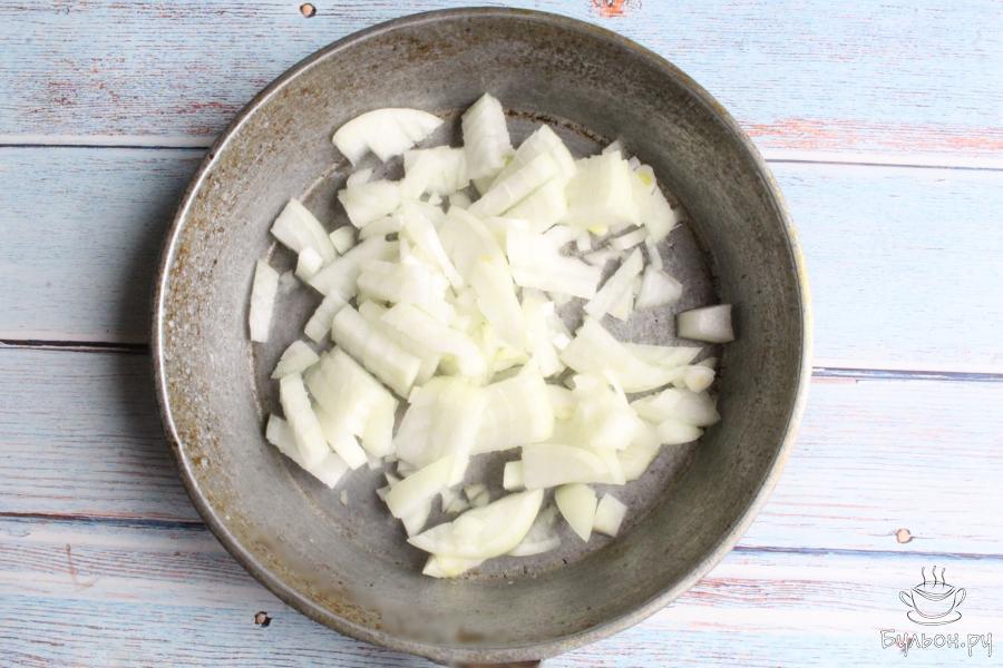 3. Лук почистим, промоем, мелко нарежем и обжарим лук на разогретом масле до мягкости. На это уходит 5-6 минут.
