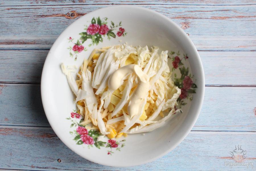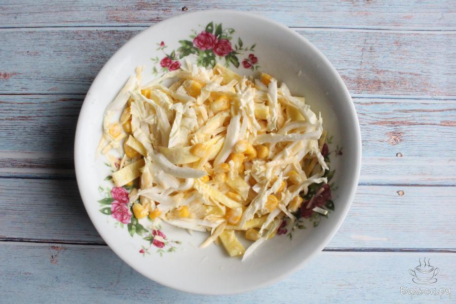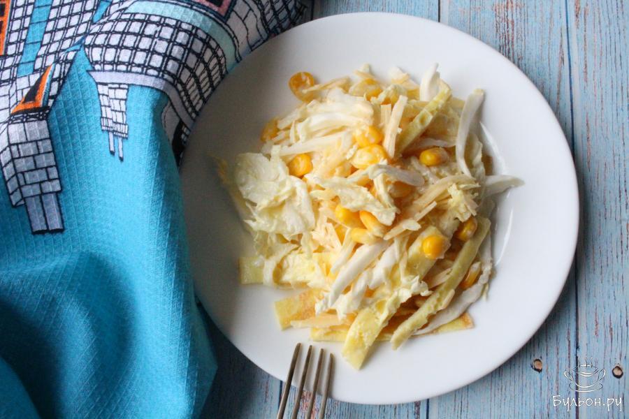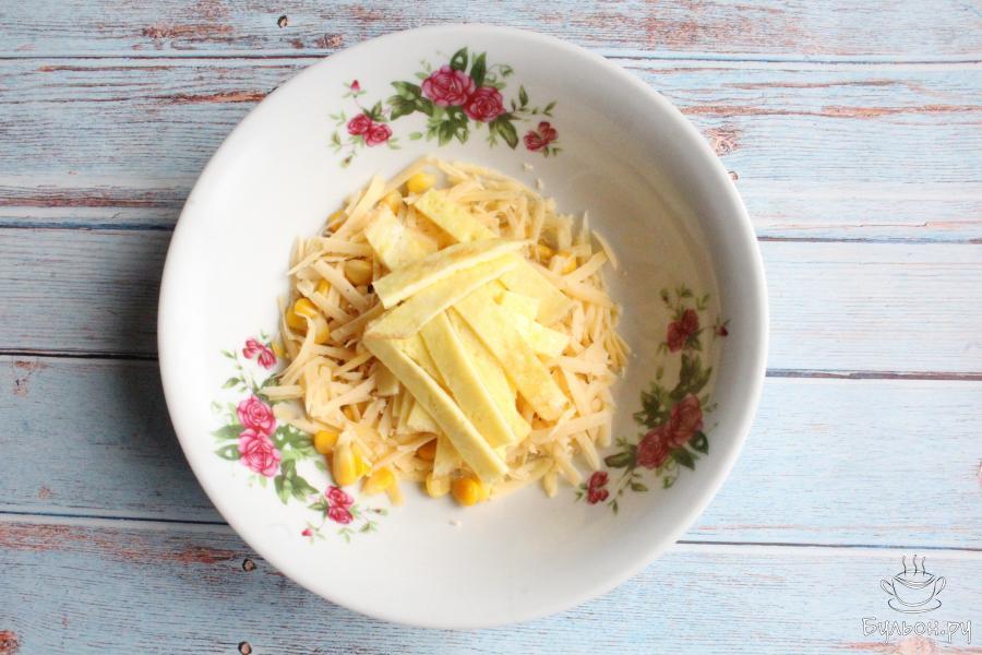 Этот салат понравится всем, кто любит кукурузу. Салат с кукурузой и яичными блинчиками получается приятно сладкий, нежный, насыщенный и легкий. Если хочется устроить себе небольшую разгрузку, то порцией такого салата вполне можно заменить ужин. Приготовление салата не займет много вашего времени, готовится он быстро и легко. Сыр для салата выбирайте тот, который любят ваши близкие. Вместо майонеза такой салат можно заправить не кислой домашней сметаной.