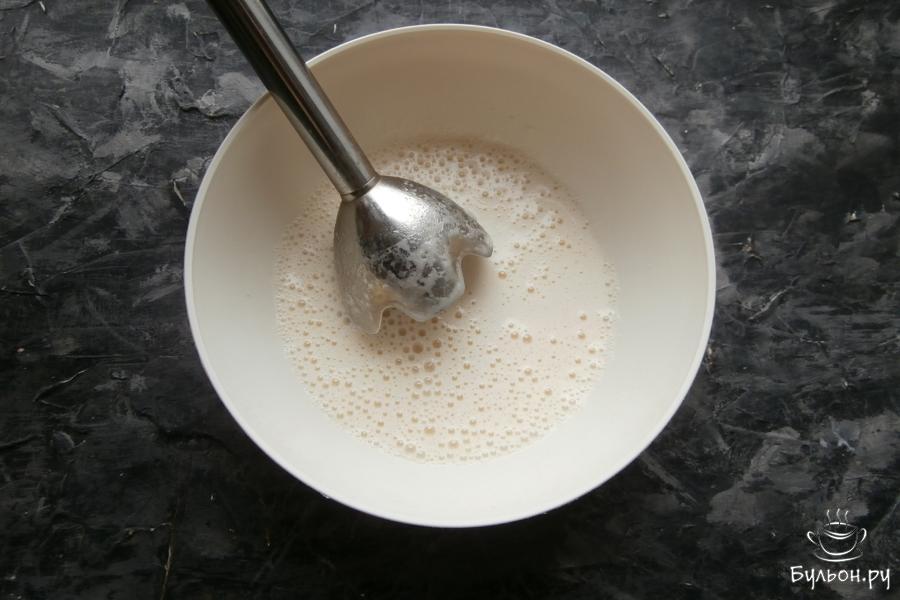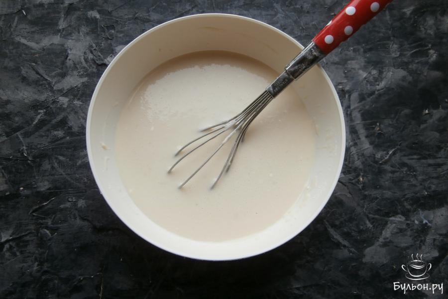 5. Венчиком замесить нежное, однородное блинное тесто (не густое, но и не жидкое). Оставить тесто минут на 15 в покое.