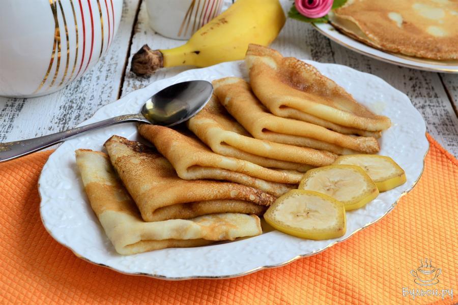 Попробуйте приготовить на завтрак для своих близких необычайно вкусные банановые блинчики, которые обязательно понравятся всем. Эти блинчики очень нежные и ароматные, с легким банановым послевкусием. Подать такие блинчики можно со сладким сиропом, медом, сгущенкой и т. п. и лучше всего в теплом виде. Для выпечки этих блинов нужна хорошая новая сковорода с тефлоновым покрытием или специальная - блинная. Бананы лучше использовать спелые, мягкие. Рекомендую всем попробовать банановые блинчики - ну очень вкусные.