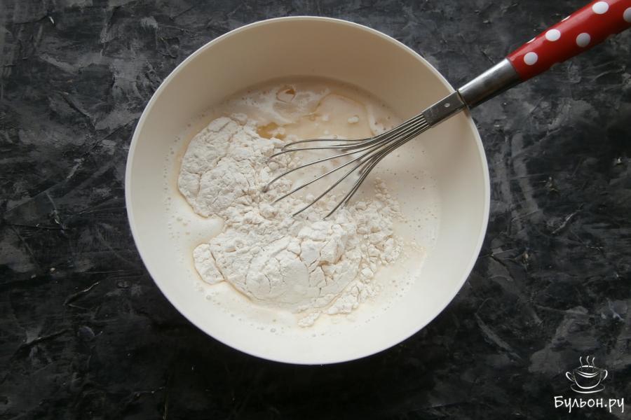 4. Влить оставшиеся половину стакана молока (100 мл) и около 80-100 мл воды, все венчиком смешать, всыпать 1 стакан (емкостью 200 мл) пшеничной муки и щепотку соды, сюда же, влить 1-2 ст. ложки любого (без запаха) растительного масла.