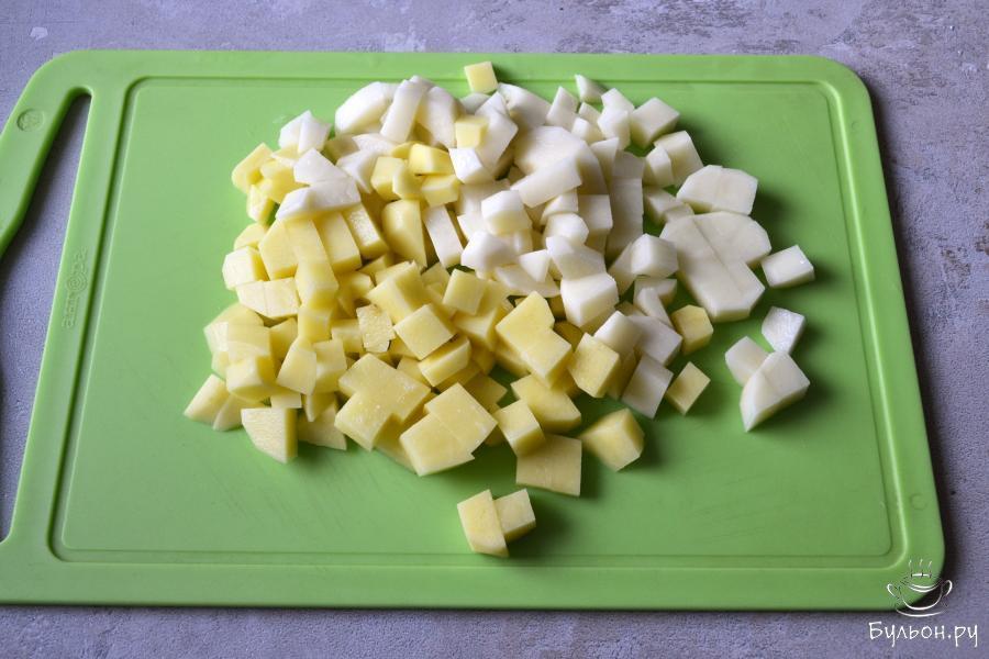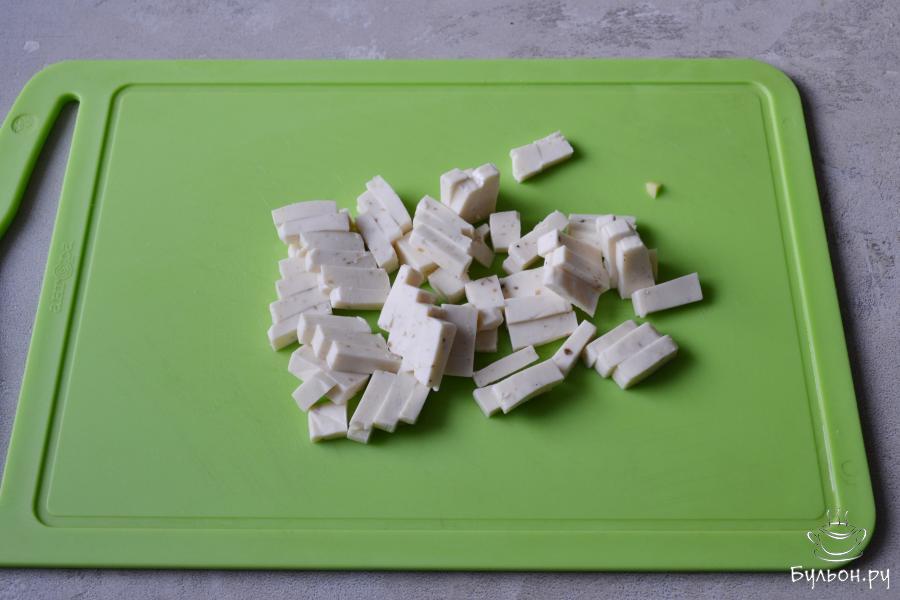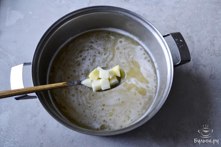 3. Плавленный сыр ТМ "Карат" для супа и соуса" нарежьте мелким кубиком и отправьте следом за картофелем в кипящий бульон.