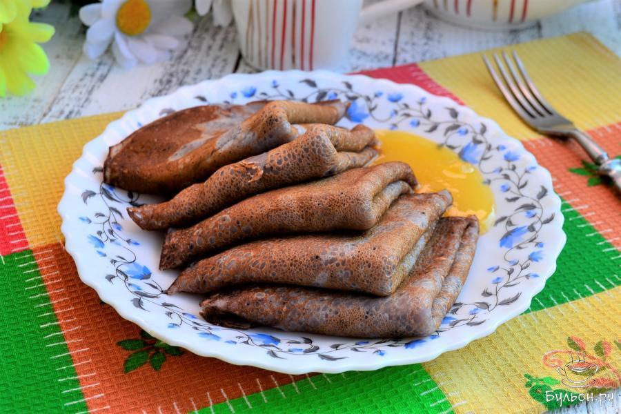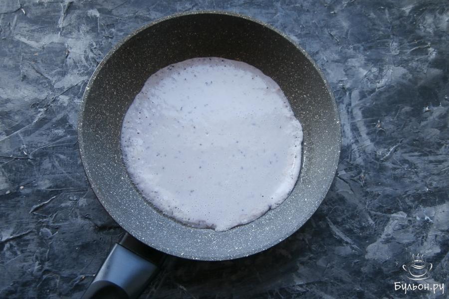 5. Сковородку хорошо разогреть, смазав для первого блина растительным маслом. Наливать в сковороду по несколько ложек теста и жарить блинчики до румяности.