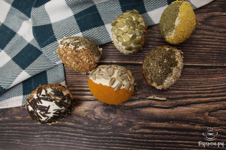 9. Для декора можно использовать мелкие крупы (рис, пшено, кукурузная крупа), семечки (подсолнечника, льняные, кунжутные), сушеную измельченную зелень, шафран и др. Красочные яйца с натуральным декором готовы.