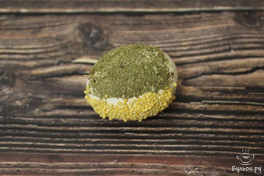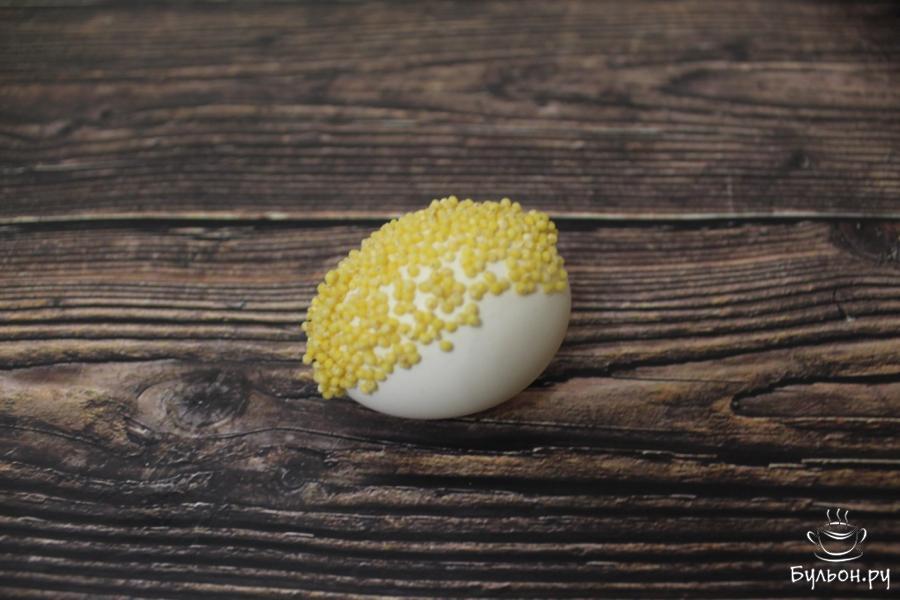 6. На остывшее отварное яйцо нанесем клей обычной кисточкой для краски на то место, которое будем покрывать той или иной крупой или приправой.