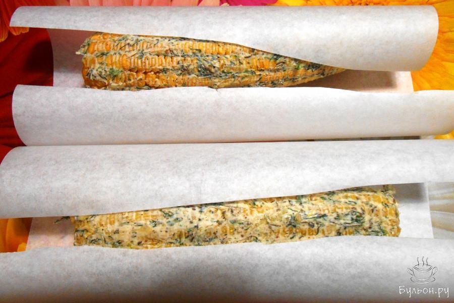 6. Запекать при температуре 180 градусов 40 минут. Замороженная кукуруза будет запекаться около 50 минут. Затем убрать фольгу и бумагу. Подавать в горячем виде. Приятного аппетита.