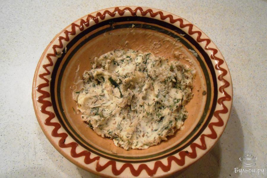 2. Приготовить маринад. В емкости соединить размягченное сливочное масло, выдавленный через пресс чеснок, мелко нарезанный укроп, кориандр, тмин, соль, сухой базилик и черный молотый перец. Перемешать.