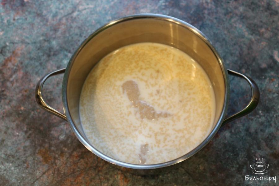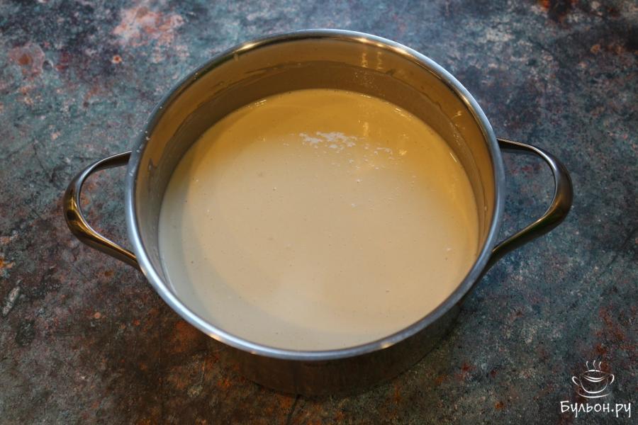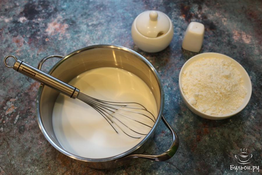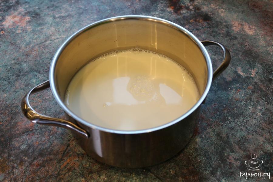 1. Берем большую кастрюлю, в которую вливаем молоко 3,2% жирности и воду. Ставим их на плиту и греем. Их температура должна стать 40-45 градусов.