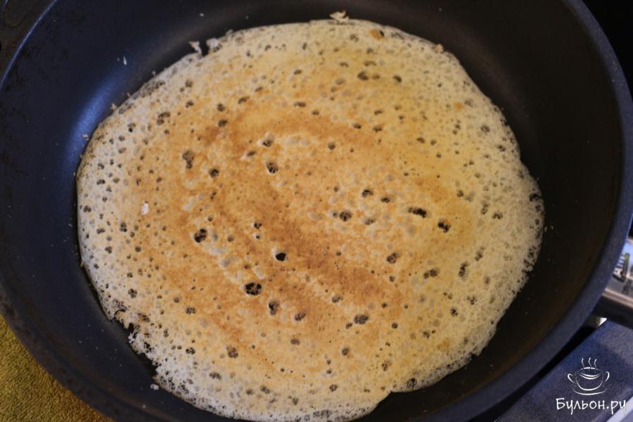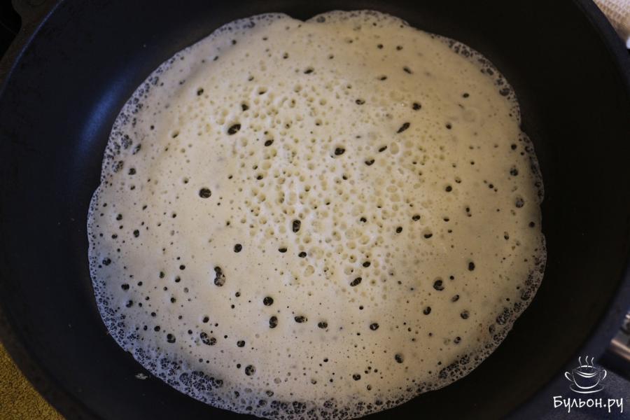 7. В середину разогретой сковороды вольем тесто и быстро распределим его по дну сковороды. Жарим блин с первой стороны до зарумянивания.