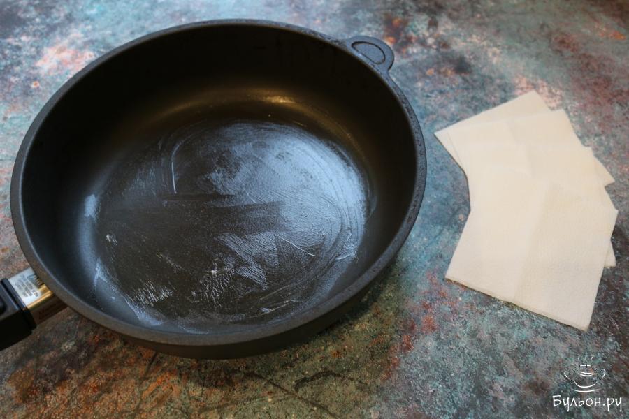 6. Перемешиваем еще раз тесто и приступаем к обжарке блинов. Сковороду смажем сливочным масла, излишки которого уберем салфеткой. Разогреем сковороду.