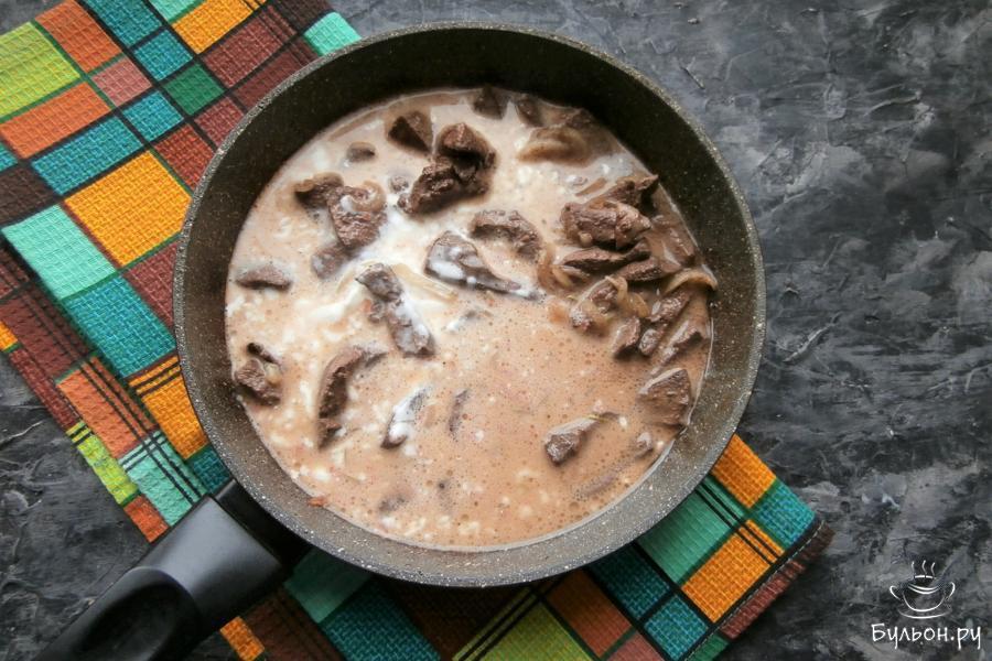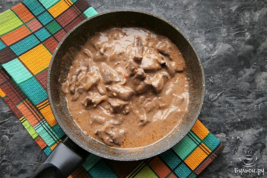 8. Тонкой струйкой влить мучную смесь в сковороду и загустить блюдо, выдержав его на огне еще минуты 2-3. Все немного поперчить и перемешать. Накрыть сковороду крышкой и оставить бефстроганов в таком виде на 5 минут.