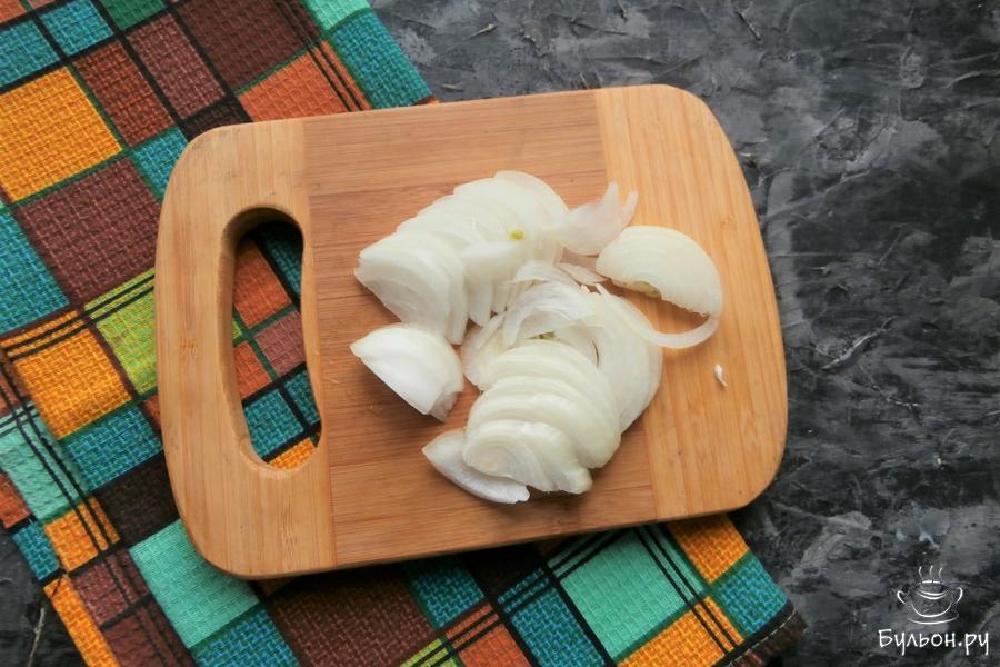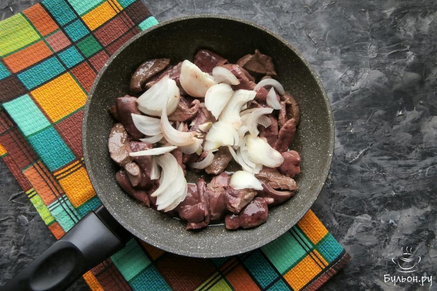 4. Печенку выложить в сковородку с разогретым (20 г) любым растительным маслом. Обжарить ее пару минут, добавить лук. Обжаривать печень далее до изменения цвета (5-6 мин.).