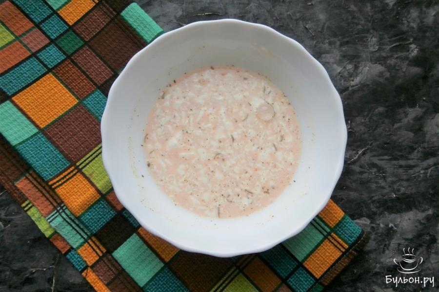 5. 80 г сметаны смешать с 100 мл воды, добавить 1 ч. л. пасты из томатов, 0,5 ч. л. приправы, 1 ч. л. сахара. Все тщательно смешать.