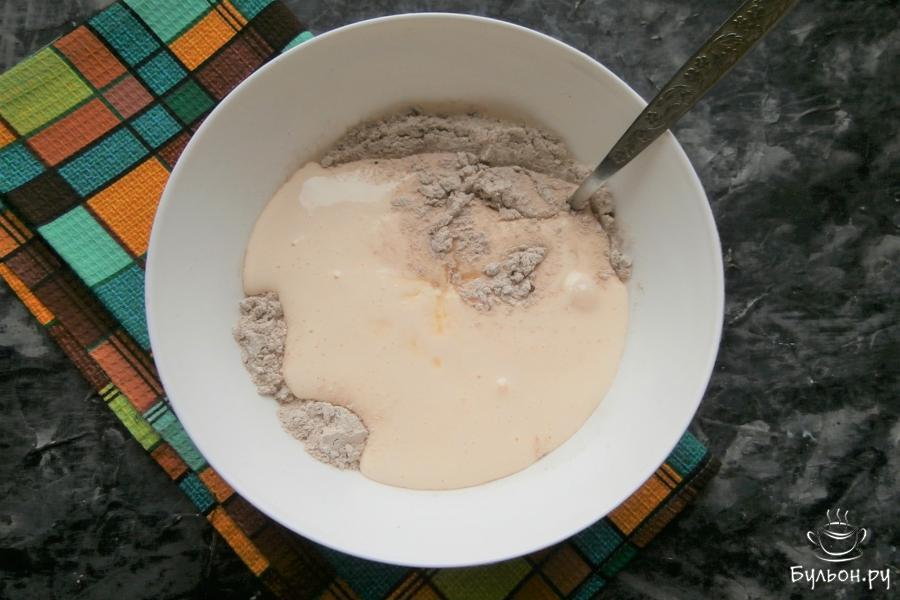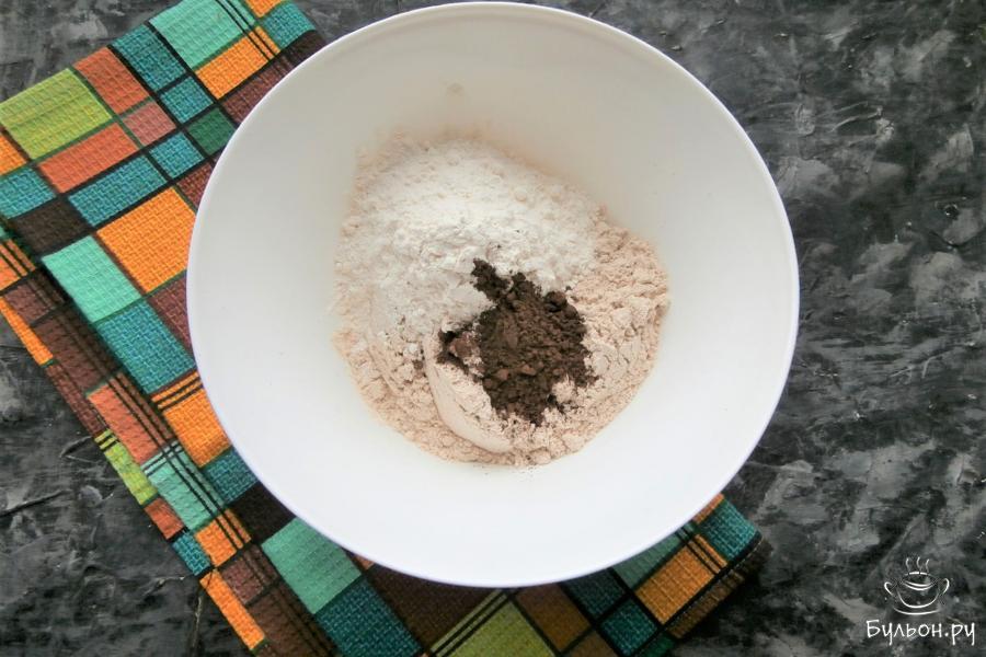 3. В большую миску всыпать 2 стакана (200 мл) овсяной муки, 0,5 стакана белой пшеничной муки, добавить 1 ст. л. темного какао-порошка. Все перемешать.