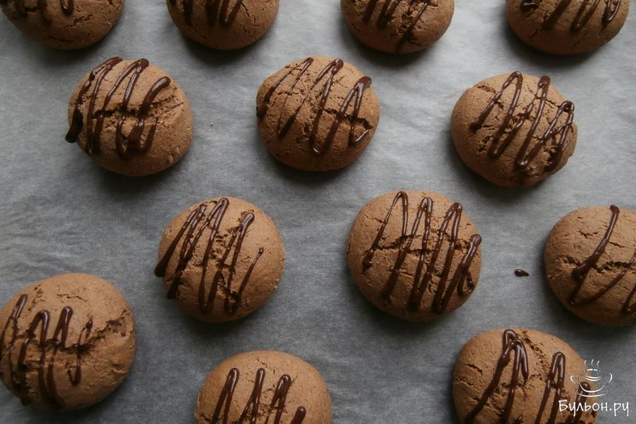 9. Дать печенью остыть, украсить его полосочками растопленного черного шоколада (50 г). На некоторое время печенье поместить в холодильник, чтобы шоколад застыл.